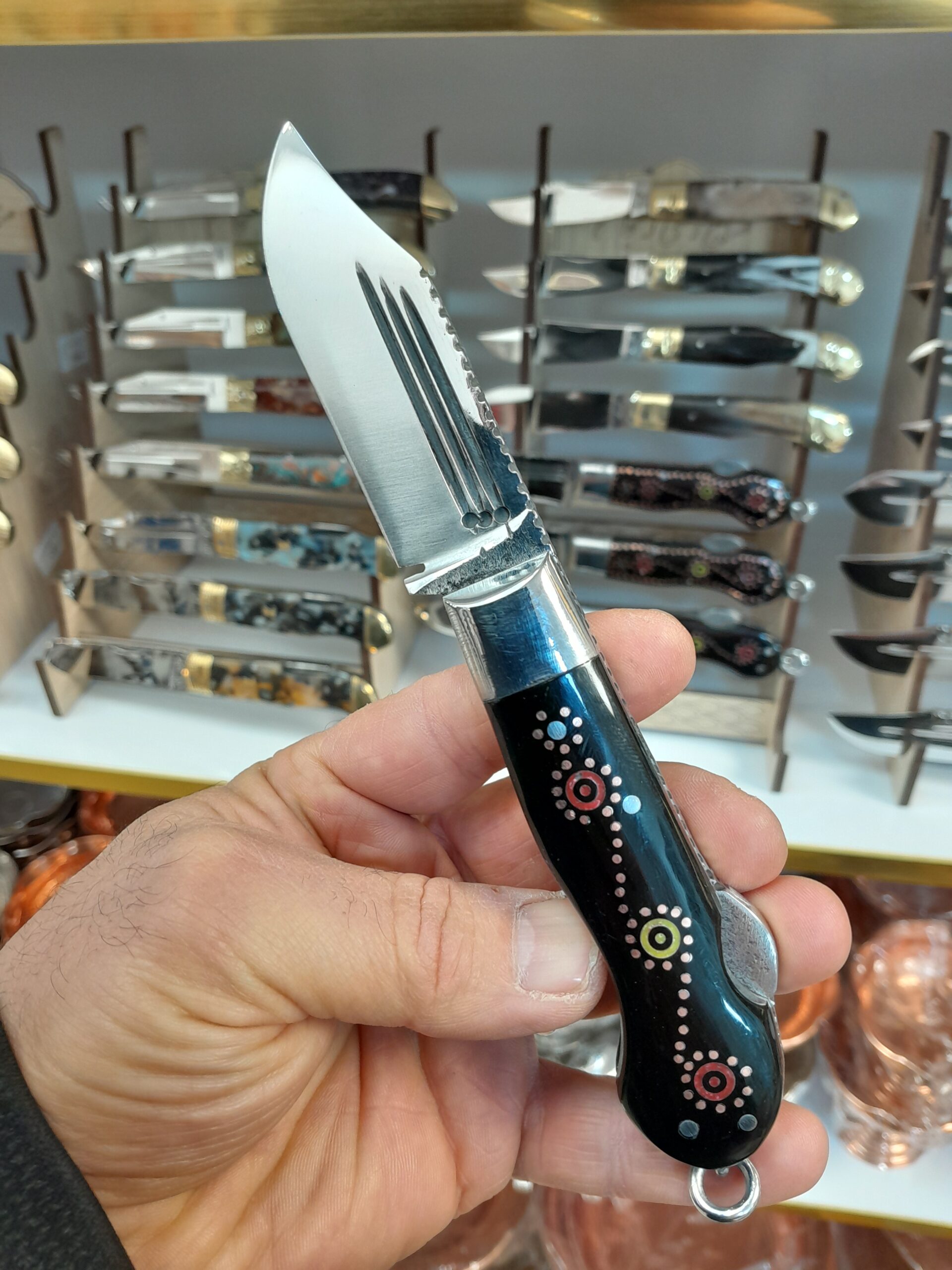 چاقوی سنتی میانه ای با دسته شاخ گاو میش و استخوان شتر به صورت نقره کوبی شده بابا تیغه فولادی مخصوص دکوراسیون کلکسیون و چاقو بازها